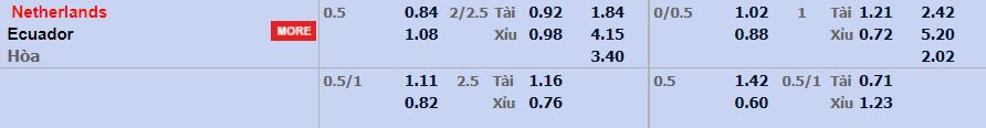 - Mức kèo nhà cái cược chấp trực tiếp trận này: Hà Lan chấp 0,5 trái. Hà Lan ăn 0,84. Ecuador ăn 1,08