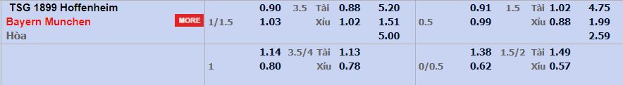- Mức kèo nhà cái cược chấp trận này: Bayern Munich chấp 1,25 trái. Hoffenheim ăn 0,90. Bayern Munich ăn 1,03