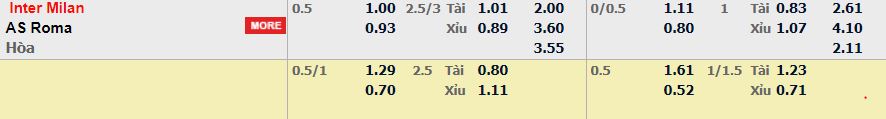 - Mức kèo nhà cái cược chấp trận này: Inter Milan chấp 0,5 Trái. Inter Milan ăn 1,00. AS Roma ăn 0,93