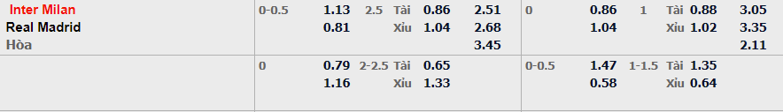 - Mức kèo nhà cái cược chấp trận này: Inter Milan chấp 0,25 Trái. Inter Milan ăn 1,13. Real Madrid ăn 0,81
