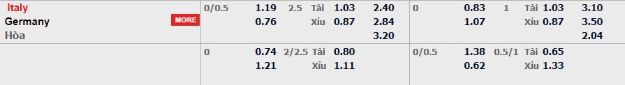 - Mức kèo nhà cái cược chấp trận này: Italy chấp 0,25 Trái. Italy ăn 1,19. Đức ăn 0,76