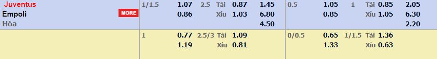 - Mức kèo nhà cái cược chấp trận này: Juventus chấp 1,25 trái. Juventus ăn 1,07. Empoli ăn 0,86