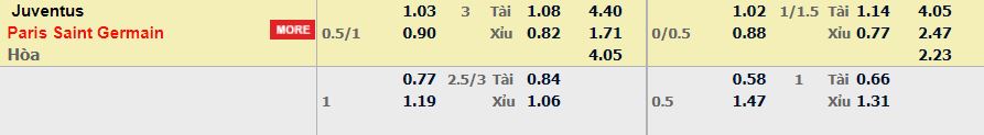 - Mức kèo nhà cái cược chấp trận này: Paris SG chấp 0,75 trái. Juventus ăn 1,03. Paris SG ăn 0,90