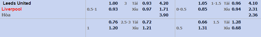 - Mức kèo nhà cái cược chấp trận này: Liverpool chấp 0,75 Trái. Leeds Utd ăn 1,00. Liverpool ăn 0,93