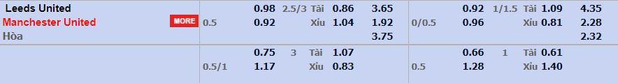 - Mức kèo nhà cái cược chấp trận này: Man Utd chấp 0,5 Trái. Leeds Utd ăn 0,98. Leeds Utd ăn 0,92