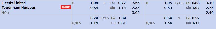 - Mức kèo nhà cái cược chấp trận này: Hòa – Được – Thua. Leeds Utd ăn 1,08. Tottenham ăn 0,84