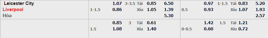 - Mức kèo nhà cái cược chấp trận này: Liverpool chấp 1,25 Trái. Leicester City ăn 1,07. Liverpool ăn 0,86