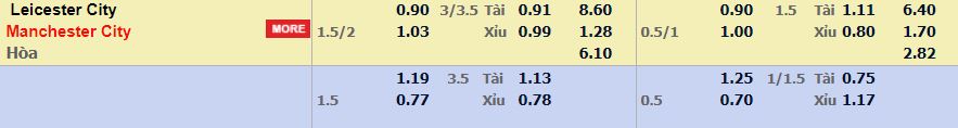 - Mức kèo nhà cái cược chấp trận này: Manchester City chấp 1,75 trái. Leicester City ăn 0,90. Manchester City ăn 1,03