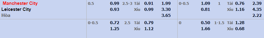 - Mức kèo nhà cái đưa ra trận này: Manchester City chấp 0,5 Trái. Manchester City ăn 0,99. Leicester City ăn 0,93