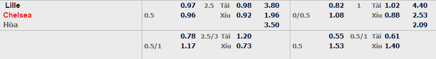 - Mức kèo nhà cái cược chấp trận này: Chelsea chấp 0,5 Trái. Lille OSC ăn 0.97. Chelsea ăn 0,96