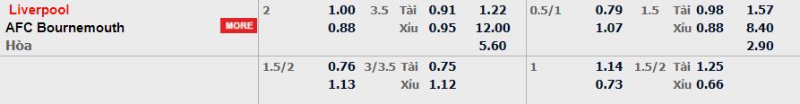 - Mức kèo nhà cái cược chấp trận này: Liverpool chấp 2 Trái. Liverpool ăn 1,00. Bournemouth ăn 0,88