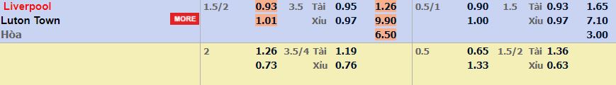 - Mức kèo nhà cái cược chấp trận này: Liverpool chấp 1,75 trái. Liverpool ăn 0,93. Luton Town ăn 1,01