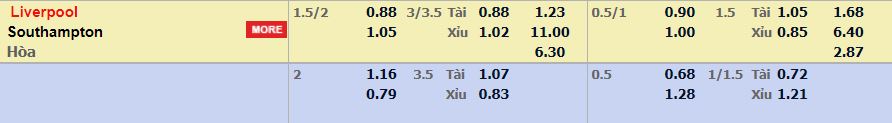 - Mức kèo nhà cái cược chấp trận này: Liverpool chấp 1,75 trái. Liverpool ăn 0,88. Southampton ăn 1,05