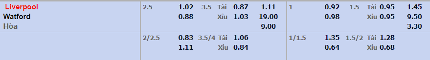 - Mức kèo nhà cái cược chấp trận này: Liverpool chấp 2,5 Trái. Liverpool ăn 1,02. Watford ăn 0,88