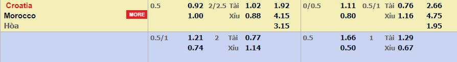 - Mức kèo nhà cái cược chấp trận này: Croatia chấp 0,5 trái. Croatia ăn 0,92. Ma Rốc ăn 1,00