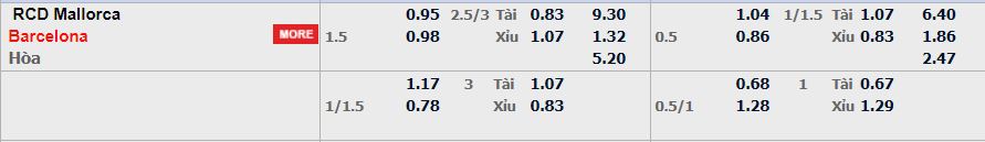 Mallorca chưa bao giờ được coi là đối trọng của Barcelona ngay cả khi gã khổng lồ xứ Catalan trong thời điểm suy nhất, lần cuối ta được chứng kiến chiến bất ngờ đã là La Liga mùa giải 2008/09 với chiến thắng 2-1 của Mallorca. Qua những thống kê trên, không khó để nhận ra rằng Barcelona là cửa trên ở trong kèo chấp châu Á, điều quan trọng là các nhà cái sẽ đưa ra tỷ lệ bao nhiêu mà thôi.