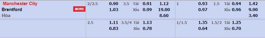 - Mức kèo nhà cái cược chấp trận này: Manchester City chấp 2,25 trái. Manchester City ăn 0,90. Brentford ăn 1,03