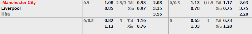 - Mức kèo nhà cái cược chấp trận này: Manchester City chấp 0,5 Trái. Manchester City ăn 1,08. Liverpool ăn 0,85