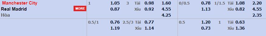 - Mức kèo nhà cái cược chấp trận này: Manchester City chấp 1 Trái. Manchester City ăn 1,05. Real Madrid ăn 0,87