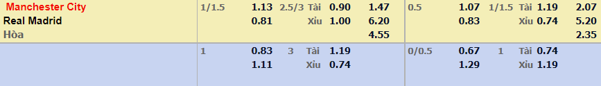 - Mức kèo nhà cái cược chấp trận này: Manchester City chấp 1,25 Trái. Manchester City ăn 1,13. Real Madrid ăn 0,81