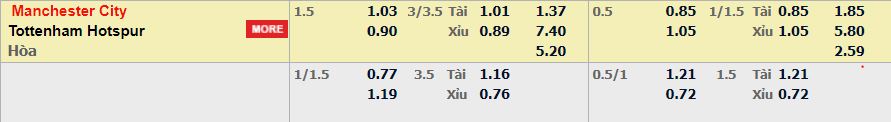 - Mức kèo nhà cái TF88 cược chấp trận này: Man City chấp 1,5 Trái. Man City ăn 1,03. Tottenham ăn 0,90