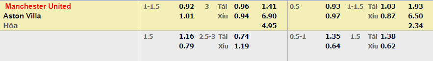 - Mức kèo nhà cái cược chấp trận này: Manchester Utd chấp 1,25 Trái. Manchester Utd ăn 0,92. Aston Villa ăn 1,01