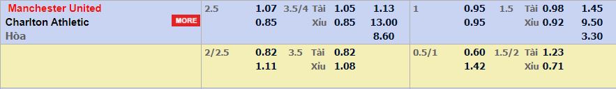 - Mức kèo nhà cái cược chấp trận này: Man Utd chấp 2,5 Trái. Man Utd ăn 1,07. Charlton ăn 0,85