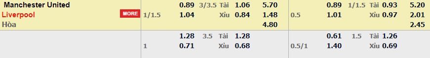 - Mức kèo nhà cái Vn88 ra cược chấp trận này: Liverpool chấp 1 Trái. Man Utd ăn 0,89. Liverpool ăn 1,04