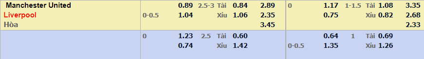 - Mức kèo nhà cái cược chấp trận này: Liverpool chấp 0,25 Trái. Manchester Utd ăn 0,89. Liverpool ăn 1,04