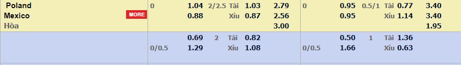 - Mức kèo nhà cái cược chấp trận này: Hòa – Được – Thua. Ba Lan ăn 1,04. Mexico ăn 0,88