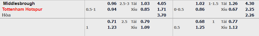 - Mức kèo nhà cái cược chấp trận này: Tottenham chấp 0,75 Trái. Middlesbrough ăn 0,96. Tottenham Hotspur ăn 0,94
