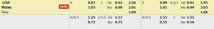 - Mức kèo nhà cái cược chấp trận này: Hòa – Được – Thua. Mỹ ăn 0,87. Wales ăn 1,05