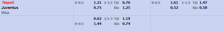 - Mức kèo nhà cái đưa ra trận này: Napoli chấp 0,25 Trái. Napoli ăn 1,25. Juventus ăn 0,75