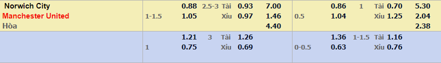 - Mức kèo nhà cái cược chấp trận này: Manchester Utd chấp 1,25 Trái. Norwich City ăn 0,88. Manchester Utd ăn 1,05