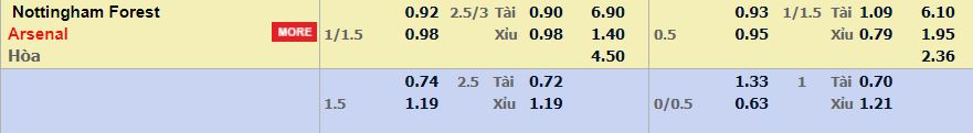 - Mức kèo nhà cái cược chấp trận này: Arsenal chấp 1,25 Trái. Nottingham Forest ăn 0,92. Arsenal ăn 0,98