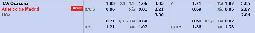 - Mức kèo nhà cái cược chấp trận này: Atl Madrid chấp 0,25 Trái. Osasuna ăn 1,03. Atl Madrid ăn 0,86