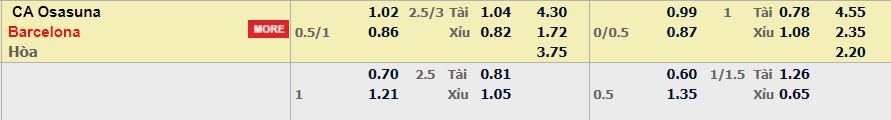 - Mức kèo nhà cái cược chấp trận này: Barcelona chấp 0,75 Trái. Osasuna ăn 1,02. Barcelona ăn 0,86