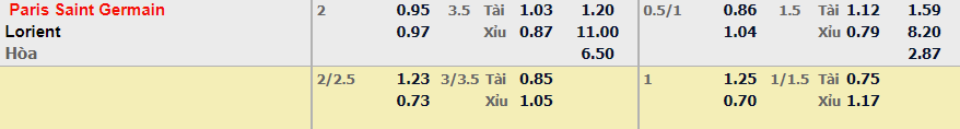 - Mức kèo nhà cái cược chấp trận này: Paris SG chấp 2 Trái. Paris SG ăn 0,95. Lorient ăn 0,97