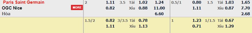 PSG trong mùa giải thống trị của mình nhưng vẫn gặp “đối cứng” của mình là Nice, đây là đối thủ đã loại đội bóng thủ đô tại cúp quốc gia cũng như giữ vững thành tích bất bại mỗi khi đụng độ tại Ligue 1, trong đó có 1 chiến thắng và 1 trận hòa. Thế nhưng đẳng cấp chênh lệch cùng với lợi thế sân nhà của PSG vẫn là điều đáng nói ở trận đấu tới, hơn nữa Nice cũng đã sa sút khá nhiều nên kèo châu Á chứng kiến cửa trên PSG bị đè ở mức khá cao 2.25 trái.