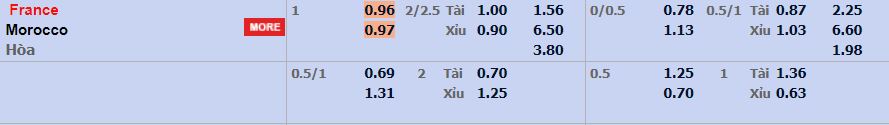 Còn tỷ lệ tài được ghi nhận ở mức 2,25 bàn trong 2 hiệp chính thức. Đây đã là vòng bán kết, mọi sai lầm đều phải trả giá nên sự chắc chắn sẽ được đặt lên hàng đầu với cả 2 đội tuyển; sẽ không có quá nhiều cơ hội trong trận này và nhiều khả năng 90 phút trận đấu sẽ có tỷ số xỉu. Thêm nữa, thông số cũng đã chỉ ra 6/10 trận vừa qua của Pháp về cửa xỉu 2,25; còn 4/5 trận đấu vừa rồi của Maroc cũng có tỷ số về xỉu.