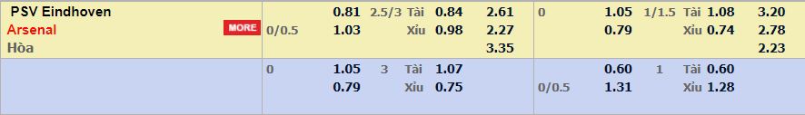 - Mức kèo nhà cái cược chấp trận này: Arsenal chấp 0,25 trái. PSV ăn 0,81. Arsenal ăn 1,03