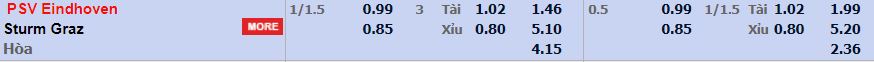 - Mức kèo nhà cái cược chấp trận này: PSV Eindhoven chấp 1,25 Trái. PSV ăn 0,99. Sturm Graz ăn 0,85