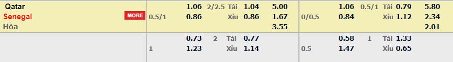 - Mức kèo nhà cái cược chấp trận này: Senegal chấp 0,75 trái. Qatar ăn 1,06. Senegal ăn 0,86