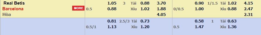 - Mức kèo nhà cái cược chấp trận này: Barcelona chấp 0,5 Trái. Real Betis ăn 1,05. Barcelona ăn 0,88