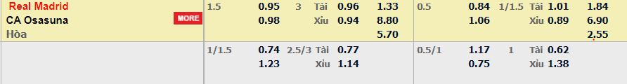 - Mức kèo nhà cái cược chấp trận này: Real Madrid chấp 1,5 Trái. Real Madrid ăn 0,95. Osasuna ăn 0,98
