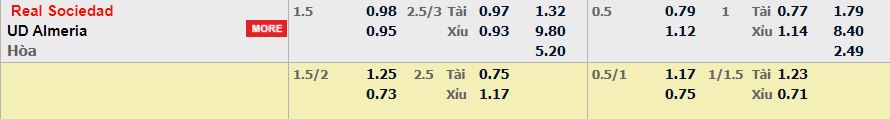 - Mức kèo nhà cái cược chấp trận này: Real Sociedad chấp 1,5 Trái. Real Sociedad ăn 0,98. Almeria ăn 0,85