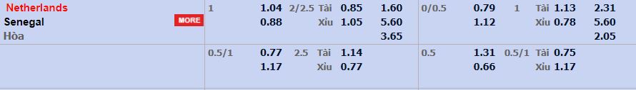 - Mức kèo nhà cái cược chấp trận này: Hà Lan chấp 1 trái. Hà Lan ăn 1,04. Senegal ăn 0,88