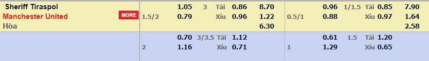 - Mức kèo nhà cái Vn88 cược chấp trận này: Man Utd chấp 1,75 Trái. Sheriff ăn 1,05. Man Utd ăn 0,79