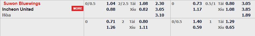 - Mức kèo nhà cái cược chấp trận này: Suwon Bluewings chấp 0,25 Trái. Suwon Bluewings ăn 1,04. Incheon Utd ăn 0,88