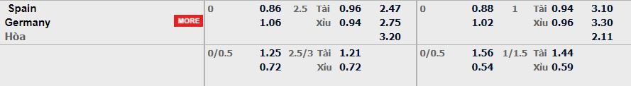 - Mức kèo nhà cái cược chấp trận này: Hòa – Được – Thua. Tây Ban Nha ăn 0,86. Đức ăn 1,06